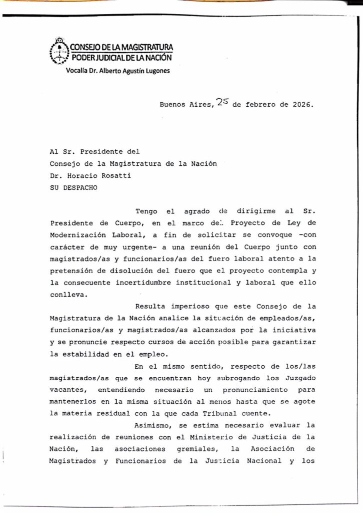 En el día de la fecha el consejero Dr. Alberto Agustín Lugones solicitó al Presidente del Consejo de la Magistratura de la Nación la convocatoria urgente del Cuerpo junto a magistrados/as y funcionarios/as del fuero laboral, ante la pretensión de disolución del fuero contemplada en la iniciativa y la consecuente incertidumbre institucional y laboral.