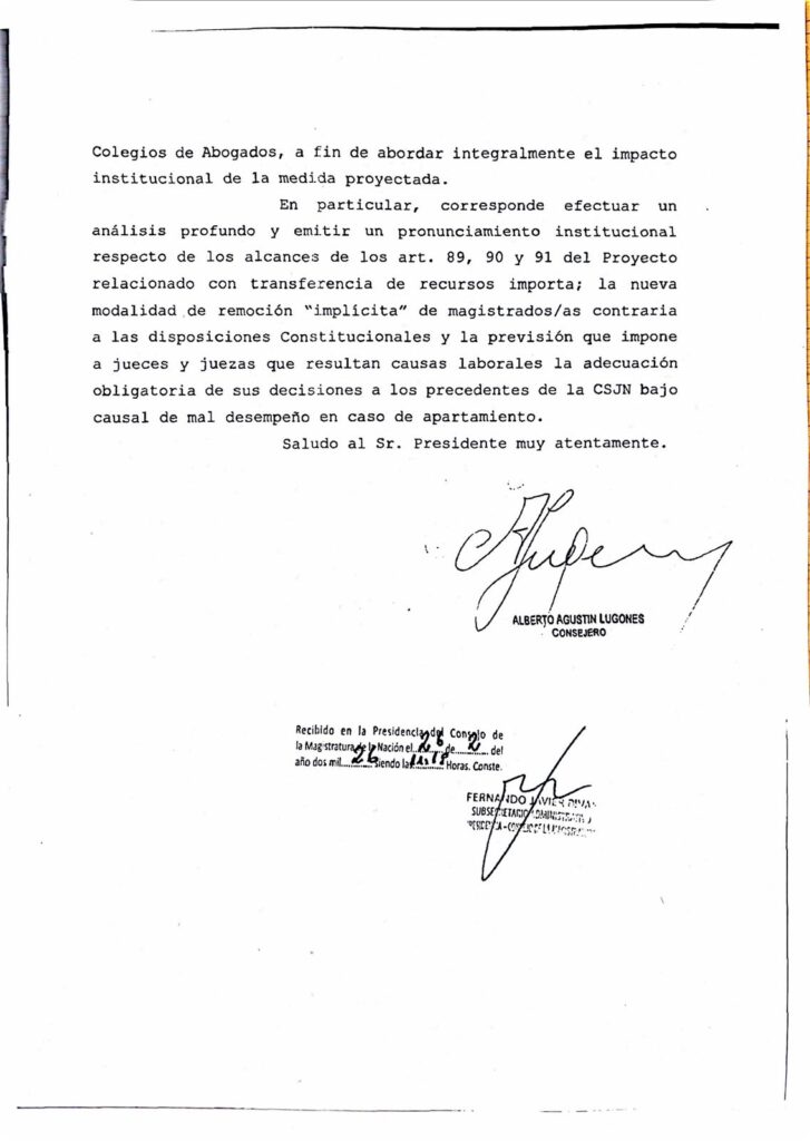 NOTA PRESENTADA POR EL DR. ALBERTO A. LUGONES AL PRESIDENTE DEL CONSEJO DE LA MAGISTRATURA DE LA NACIÓN